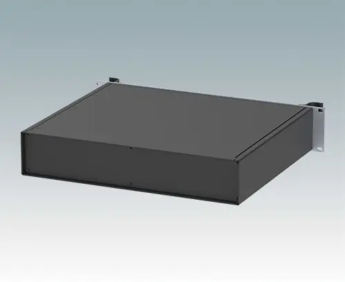 Modern aluminium 19" rack case with an anodised front panel and two ergonomic front panel handles. The case body consists of two side panels with removable top, base and rear panel. The base is pre-punched for fitting PCB mounting pillars or the accessory internal mounting plate. All parts are provided with M4 earth studs for electrical continuity.