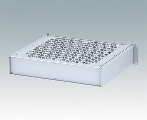 Modern ventilated aluminium 19" rack case with an anodised front panel and two ergonomic front panel handles. The case body consists of two side panels with removable top, base and rear panel. The base is pre-punched for fitting PCB mounting pillars or the accessory internal mounting plate. All parts are provided with M4 earth studs for electrical continuity.