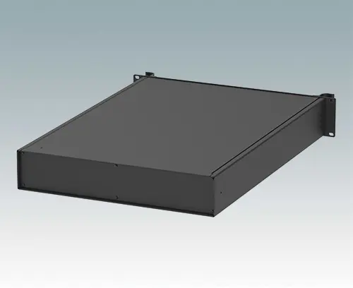 Modern aluminium 19" rack case, 24" deep, with a painted black front panel and two ergonomic front panel handles. The case body consists of two side panels with removable top, base and rear panel. The base is pre-punched for fitting PCB mounting pillars or the accessory internal mounting plate. All parts are provided with M4 earth studs for electrical continuity.
