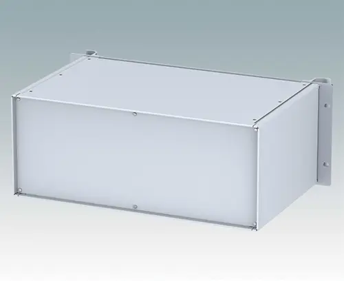 Modern aluminium 19" rack case with an anodised front panel and two ergonomic front panel handles. The case body consists of two side panels with removable top, base and rear panel. The base is pre-punched for fitting PCB mounting pillars or the accessory internal mounting plate. All parts are provided with M4 earth studs for electrical continuity.