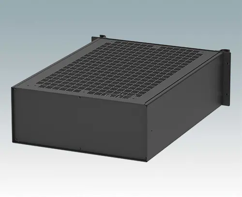 Modern ventilated aluminium 19" rack case, 24" deep, with a painted black front panel and two ergonomic front panel handles. The case body consists of two side panels with removable top, base and rear panel. The base is pre-punched for fitting PCB mounting pillars or the accessory internal mounting plate. All parts are provided with M4 earth studs for electrical continuity.
