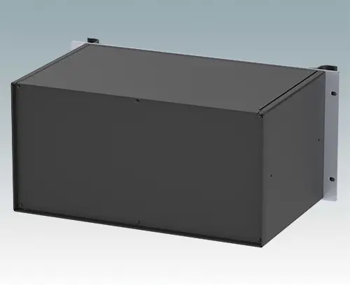 Modern aluminium 19" rack case with an anodised front panel and two ergonomic front panel handles. The case body consists of two side panels with removable top, base and rear panel. The base is pre-punched for fitting PCB mounting pillars or the accessory internal mounting plate. All parts are provided with M4 earth studs for electrical continuity.
