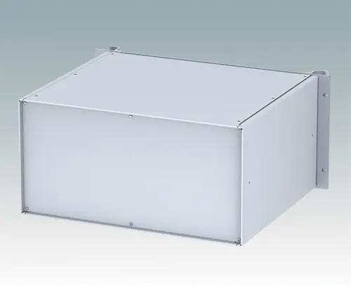 Modern aluminium 19" rack case with an anodised front panel and two ergonomic front panel handles. The case body consists of two side panels with removable top, base and rear panel. The base is pre-punched for fitting PCB mounting pillars or the accessory internal mounting plate. All parts are provided with M4 earth studs for electrical continuity.
