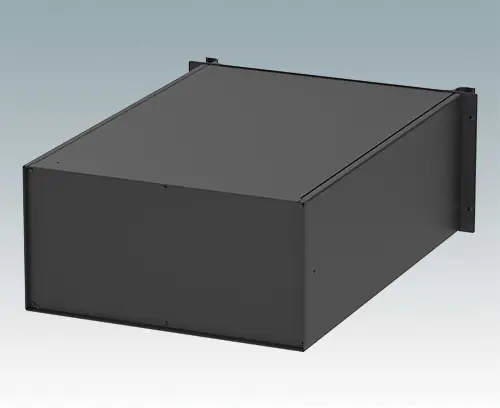 Modern aluminium 19" rack case, 24" deep, with a painted black front panel and two ergonomic front panel handles. The case body consists of two side panels with removable top, base and rear panel. The base is pre-punched for fitting PCB mounting pillars or the accessory internal mounting plate. All parts are provided with M4 earth studs for electrical continuity.