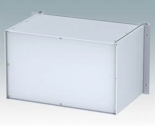 Modern aluminium 19" rack case with an anodised front panel and two ergonomic front panel handles. The case body consists of two side panels with removable top, base and rear panel. The base is pre-punched for fitting PCB mounting pillars or the accessory internal mounting plate. All parts are provided with M4 earth studs for electrical continuity.
