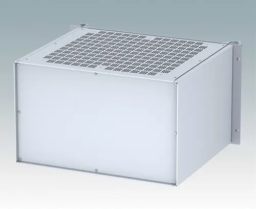 Modern ventilated aluminium 19" rack case with an anodised front panel and two ergonomic front panel handles. The case body consists of two side panels with removable top, base and rear panel. The base is pre-punched for fitting PCB mounting pillars or the accessory internal mounting plate. All parts are provided with M4 earth studs for electrical continuity.