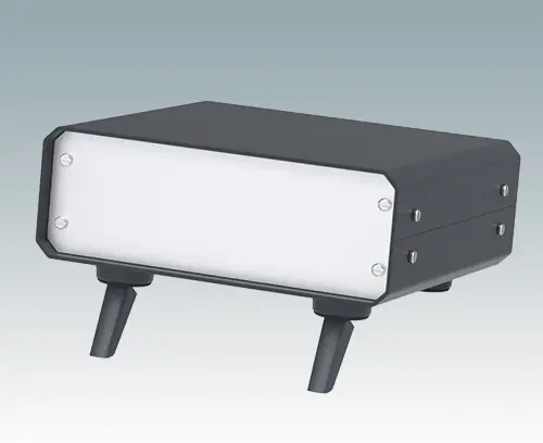 Stylish and modern case feet with tilt legs for canting. Universal design for fitting to any type of plastic or metal enclosure. Four part assembly with foot body, push-in anti-skid TPE pad, tilt leg with 120° rotation and self-tapping screw. Max. enclosure wall thickness 3 mm with screws provided (alternative screws can be supplied for larger wall thicknesses). Simply drill three holes per foot in the enclosure panel - see drawings for drilling details.