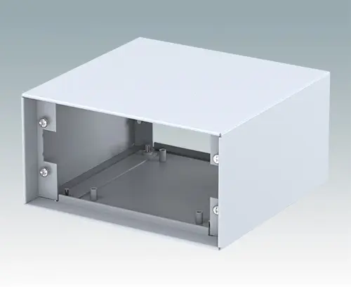 Modern instrument case for small desktop and portable electronics. Folded aluminium top and base covers are assembled by hidden fixing screws on the underside. Front and rear apertures are recessed by 8 mm and 14 mm at the opposite ends. Order front and rear panels separately.