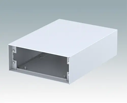 Modern instrument case for small desktop and portable electronics. Folded aluminium top and base covers are assembled by hidden fixing screws on the underside. Front and rear apertures are recessed by 8 mm and 14 mm at the opposite ends. Order front and rear panels separately.