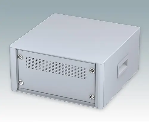 Modern and highly attractive 10.5" instrument enclosure for mounting 3U subracks (42HP), chassis or front panels. Conforms to DIN 41494 & IEC 297. Stylish front and rear bezels are fitted to the aluminium case body. Clip-on trims at the front and rear hide the assembly screws giving a very professional appearance. All case panels fitted with M4 threaded pillars for earth connection. The case is supplied with a rear panel, two ABS side handles and four ABS non-slip feet. Ventilation slots are provided in the base and rear panel. Internal chassis runners support the 10.5" equipment.
