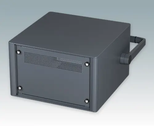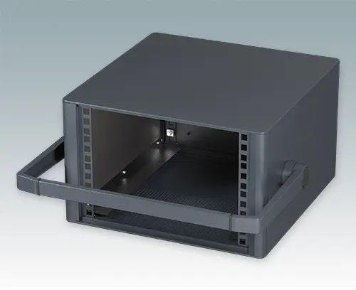 Modern and highly attractive 10.5" instrument enclosure for mounting 4U subracks (42HP), chassis or front panels. Conforms to DIN 41494 & IEC 297. Stylish front and rear bezels are fitted to the aluminium case body. Clip-on trims at the front and rear hide the assembly screws giving a very professional appearance. All case panels fitted with M4 threaded pillars for earth connection. The case is supplied with a rear panel, a tilt/swivel carry handle and four ABS non-slip feet. Ventilation slots are provided in the base and rear panel. Internal chassis runners support the 10.5" equipment.