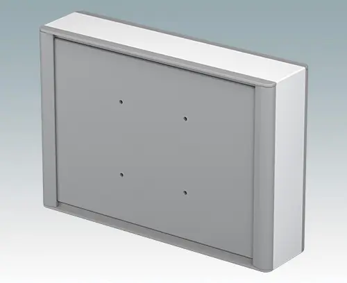 Modern and highly attractive aluminium instrument enclosure for fitting displays, touch screens and HMI electronics. VESA MIS-D 100 mounting points are provided on the rear panel for fitting the unit to a standard VESA control arm or mounting bracket. Stylish front and rear diecast bezels are fitted to the case body. Clip-on trims at the front and rear hide all the assembly screws, giving a very professional appearance. The base panel on the underside provides space for cable entry. M3 PCB mounting pillars are provided inside. The assembly extrusions also have M3 mounting holes and guide rails for fitting internal plates. M4 earth studs are fitted to all parts; some studs can also be used with retaining straps to hold the front/rear panels during maintenance. Front panels are sold separately. Accessories include a wall mounting kit, a pole mounting bracket and an internal mounting plate.