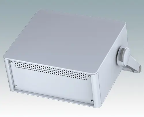 Modern and highly attractive instrument enclosure with handle/bail arm for desktop and portable electronics. Stylish front and rear bezels are fitted to the aluminium case body. Clip-on trims at the front and rear hide the assembly screws and front panel screws, giving a very professional appearance. The handle can be indexed at 30° increments. The pre-assembled internal chassis is supplied with four M3 PCB mounting pillars fitted to the base panel. The internal chassis can also be fitted with 5 slide-in PCBs using the accessory snap-in guide M6490020 (order 2 guides per PCB).