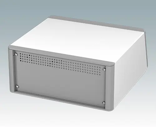 Modern and highly attractive instrument enclosure with sloping front bezel for desktop or portable electronics. Stylish front and rear bezels are fitted to the aluminium case body. Clip-on trims at the front and rear hide the assembly screws and front panel screws, giving a very professional appearance. The pre-assembled internal chassis is supplied with four M3 PCB mounting pillars fitted in the base. The internal chassis can also be fitted with 5 slide-in PCBs using the accessory snap-in guide M6490020 (order 2 guides per PCB). The case is supplied with a rear panel and four ABS feet with tilt legs. Ventilation slots are provided in the base and rear panel. Order front panels separately.