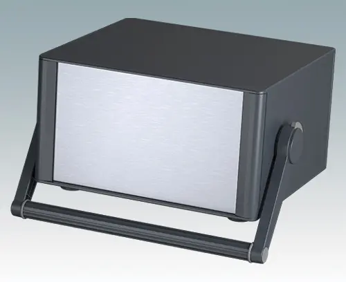 Modern and highly attractive instrument enclosure with handle/bail arm for desktop and portable electronics. Stylish front and rear bezels are fitted to the aluminium case body. Clip-on trims at the front and rear hide the assembly screws and front panel screws, giving a very professional appearance. The handle can be indexed at 30° increments. The pre-assembled internal chassis is supplied with four M3 PCB mounting pillars fitted to the base panel. The internal chassis can also be fitted with 9 slide-in PCBs using the accessory snap-in guide M6490010 (order 4 guides per PCB).