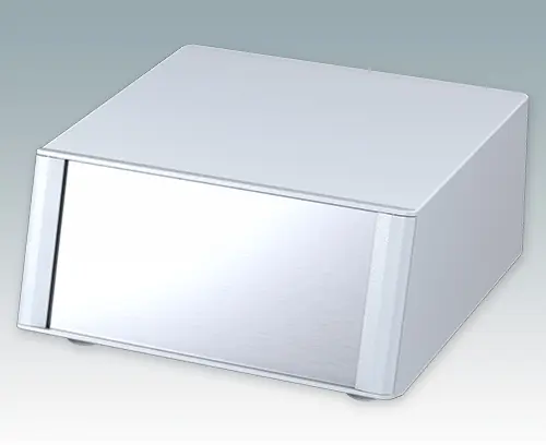 Modern and highly attractive instrument enclosure with sloping front bezel for desktop or portable electronics. Stylish front and rear bezels are fitted to the aluminium case body. Clip-on trims at the front and rear hide the assembly screws and front panel screws, giving a very professional appearance. The pre-assembled internal chassis is supplied with four M3 PCB mounting pillars fitted in the base. The internal chassis can also be fitted with 7 slide-in PCBs using the accessory snap-in guide M6490010 (order 4 guides per PCB). The case is supplied with a rear panel and four ABS feet with tilt legs. Ventilation slots are provided in the base and rear panel. Order front panels separately.