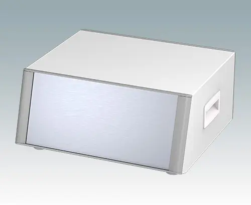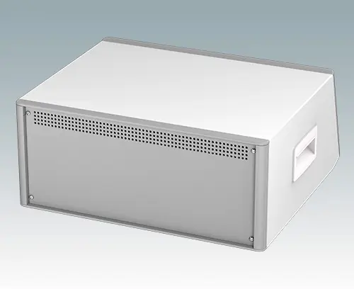 Modern and highly attractive instrument enclosure with sloping front bezel for desktop or portable electronics. Stylish front and rear bezels are fitted to the aluminium case body. Clip-on trims at the front and rear hide the assembly screws and front panel screws, giving a very professional appearance. The pre-assembled internal chassis is supplied with four M3 PCB mounting pillars fitted in the base. The internal chassis can also be fitted with 9 slide-in PCBs using the accessory snap-in guide M6490010 (order 4 guides per PCB). The case is supplied with a rear panel, two ABS side handles and four ABS feet with tilt legs. Ventilation slots are provided in the base and rear panel. Order front panels separately.