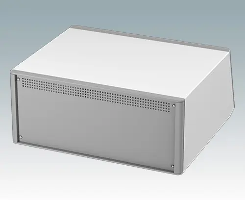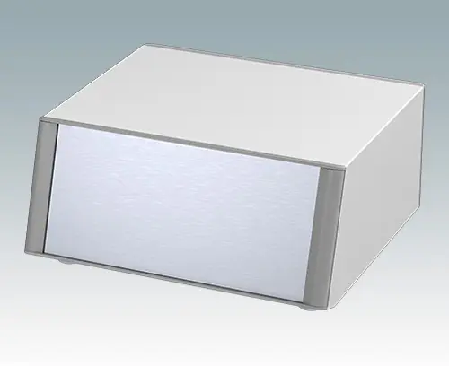 Modern and highly attractive instrument enclosure with sloping front panel for desktop or portable electronics. Stylish front and rear bezels are fitted to the aluminium case body. Clip-on trims at the front and rear hide the assembly screws and front panel screws, giving a very professional appearance. The pre-assembled internal chassis is supplied with four M3 PCB mounting pillars fitted in the base. The internal chassis can also be fitted with 9 slide-in PCBs using the accessory snap-in guide M6490010 (order 4 guides per PCB). The case is supplied with a rear panel and four ABS feet with tilt legs. Ventilation slots are provided in the base and rear panel. Order front panels separately.