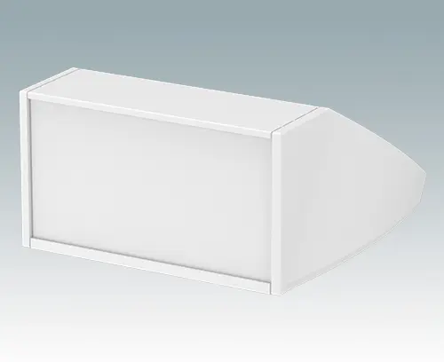 Ergonomic IP 54 rated sloping front enclosure for desktop or wall mounted electronics equipment. Pre-assembled aluminium case body with removable base panel. Front aperture for mounting the accessory front panels. Recessed rear face for mounting switches and power and data connections. To maintain IP 54 rating, fit PCB pillars M5600001, or your own plugs to the mounting holes in the base panel.