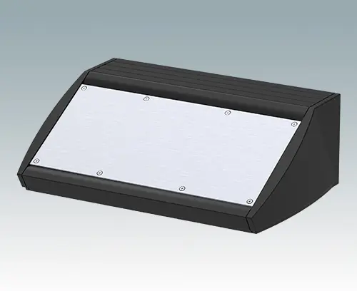 Ergonomic sloping front enclosure for desktop or wall mounted electronics equipment. Pe-assembled aluminium case body with removable base panel. Front aperture for mounting the accessory front panels.  Recessed rear face for mounting switches and power and data connections.