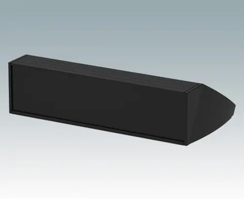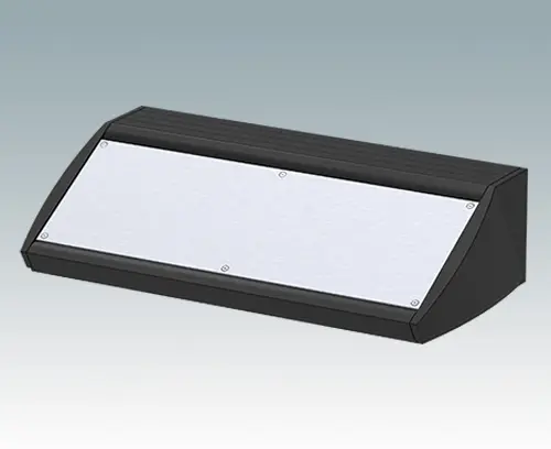 Ergonomic IP 54 rated sloping front enclosure for desktop or wall mounted electronics equipment. Pe-assembled aluminium case body with removable base panel. Front aperture for mounting the accessory front panels. Recessed rear face for mounting switches and power and data connections. To maintain IP 54 rating, fit PCB pillars M5600001, or your own plugs to the mounting holes in the base panel.