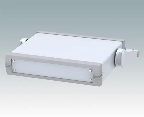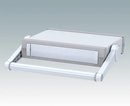 Advanced instrument enclosure with handle/bail arm for desktop and portable electronics. Stylish front and rear bezels are fitted to the fabricated case body. The handle can be indexed at 30° increments.Pre-assembled internal chassis supplied with four snap-in PCB guides. Four standard guide positions - additional positions can be punched on demand. The case is supplied with a rear panel and four non-slip feet. Order front panels separately.