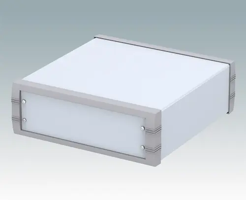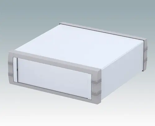 Advanced instrument enclosure for desktop electronics. Stylish front and rear bezels are fitted to the fabricated case body. Pre-assembled internal chassis supplied with four snap-in PCB guides. Four standard guide positions - additional positions can be punched on demand. The case is supplied with a rear panel and four non-slip feet. Order front panels separately.