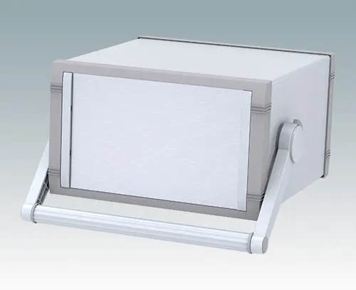 Advanced instrument enclosure with handle/bail arm for desktop and portable electronics. Stylish front and rear bezels are fitted to the fabricated case body. The handle can be indexed at 30° increments.Pre-assembled internal chassis supplied with four snap-in PCB guides. Four standard guide positions - additional positions can be punched on demand. The case is supplied with a rear panel and four non-slip feet. Order front panels separately.