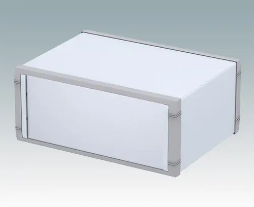 Advanced instrument enclosure for desktop electronics. Stylish front and rear bezels are fitted to the fabricated case body. Pre-assembled internal chassis supplied with four snap-in PCB guides. Four standard guide positions - additional positions can be punched on demand. The case is supplied with a rear panel and four non-slip feet. Order front panels separately.