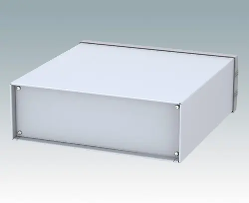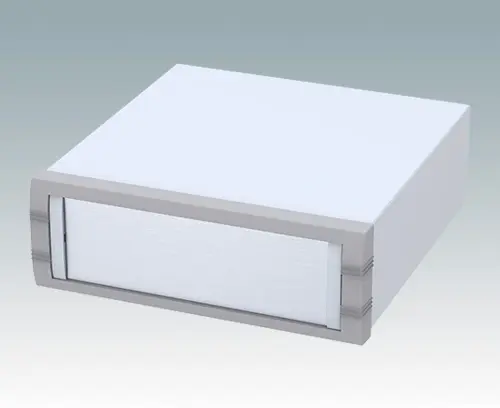 Modern instrument enclosure for desktop electronics. Highly attractive die cast front bezel is fitted to the fabricated case body. The base and rear panels are removable for easy access. Mounting holes in the base are designed for fitting the accessory PCB pillars. Order the front panel separately.