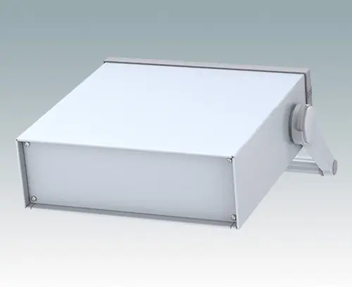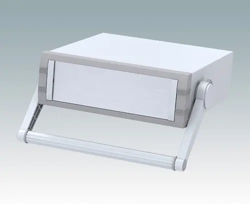 Modern instrument enclosure with handle/bail arm for desktop and portable electronics. Highly attractive die cast front bezel is fitted to the fabricated case body. The handle/bail arm can be indexed at 30° increments.The base and rear panels are removable for easy access. Mounting holes in the base are designed for fitting the accessory PCB pillars. Order the front panel separately.