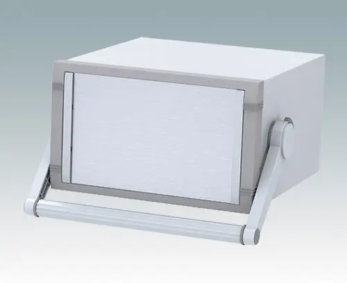Modern instrument enclosure with handle/bail arm for desktop and portable electronics. Highly attractive die cast front bezel is fitted to the fabricated case body. The handle/bail arm can be indexed at 30° increments.The base and rear panels are removable for easy access. Mounting holes in the base are designed for fitting the accessory PCB pillars. Order the front panel separately.